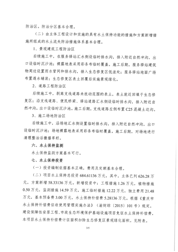 本项目水土保持总投资684.61136万元,其中,主体已列626.28万元,方案新增58.33136万元。新增投资中:工程措施1.26万元,植物措施0.50万元,监测措施14.59万元,施工临时措施12.22万元,独立费用21.48万元,基本预备费3.00万元,水土保持补偿费5.28136万元。根据《重庆市水土保持补偿费征收使用管理实施办法》(渝财综〔2015〕101号)规定,建设保障性安居工程、市政生态环境保护基础设施项目免征水土保持补偿费,本项目水土保持补偿费计征面积扣除生态修复区景观绿化面积。主体已列投资中:工程措施80.18万元,植物措施546.10万元。