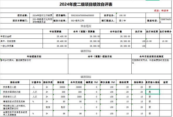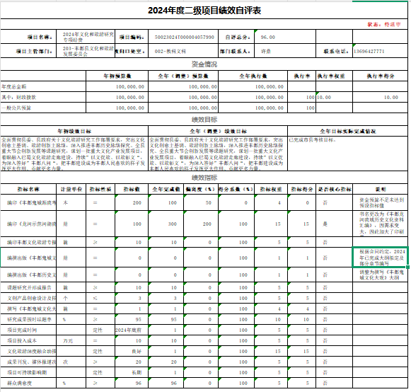 我单位对2024年丰都县文化旅游研究专项经费开展了绩效评价,涉及财政拨款项目资金25.99万元,评价得分100分,评价等次为优;对2024年非物质文化遗产保护工作经费开展了绩效评价,涉及财政拨款项目资金8万元,评价得分100分,评价等次为优;对2024年文化和旅游研究专项经费开展了绩效评价,涉及财政拨款项目资金10万元,评价得分100分,评价等次为优;对2024年驻村工作经费开展了绩效评价,涉及财政拨款项目资金2.63万元,评价得分100分,评价等次为优;对创新人才安家补助开展了绩效评价,涉及财政拨款项目资金5.36万元,评价得分100分;本次绩效评价未发现问题。