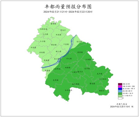 2024年2月19日16时至2月20日16时我县多云到晴,局地分散阵雨。最大降雨量为1.7毫米(南天湖景区)。龙孔、双路、三建、峰子山、三抚出现7-10级大风,极大风速25.1米/秒(武平峰子山,20日03时),最低气温4.3~17.9℃,最高气温12.7~26.6℃。丰都国家基本站最低气温13.7℃,最高气温22.9℃。