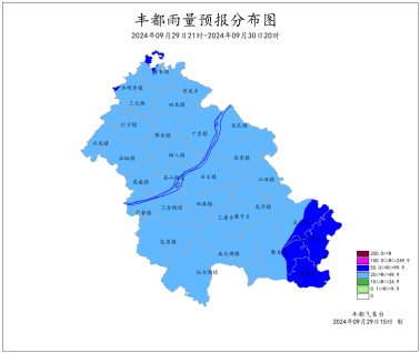 2024年9月28日16时至9月29日16时我县阴天,局地阵雨。最大降雨量为11.8mm(南天湖景区)。兴龙村、名山镇(航道)、包鸾、双路、汤圆石危岩站、社坛、三建、镇江村、农花村、丰都站、城区站、武平峰子山出现7-9级大风,极大风速21.2米/秒(武平峰子山,28日22时),最低气温16.1~31.1℃,最高气温19.5~37.6℃。丰都国家基本站最低气温28.9℃,最高气温34.9℃。
