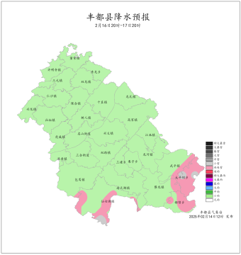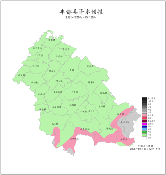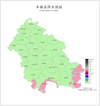 2025年2月7日16时至2月14日16时我县晴雨相间。最大周累计降雨量为11.5mm(都督沙坪村)。最低气温-11.6~2.9℃,最高气温0.5~16.3℃。丰都国家基本站周累计降雨量1.0mm,最低气温1.7℃,最高气温12.4℃。