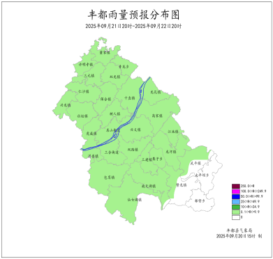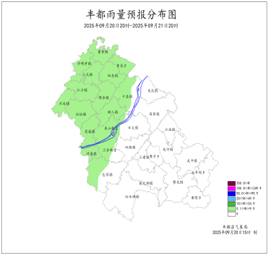 2025年9月19日16时至9月20日16时我县小到中雨,局地大雨。最大降雨量为40.3mm(三合新建)。最低气温13.0~21.5℃,最高气温16.4~29.0℃。最高气温达29.0℃(兴义)。丰都国家基本站雨量24.1mm,最低气温20.1℃,最高气温24.9℃。