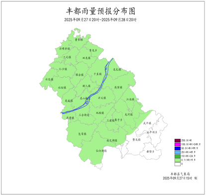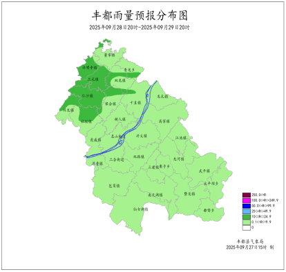 2025年9月26日16时至9月27日16时我县多云间晴,局地分散阵雨。最大降雨量为0.2mm(虎威);最低气温14.2 (南天湖景区)~22.1℃,最高气温18.3~35.0℃(兴龙)。丰都国家基本站最低气温20.9℃,最高气温29.7℃。