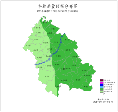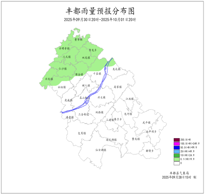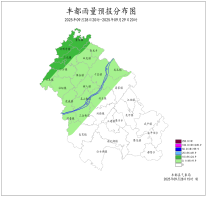 2025年9月27日16时至9月28日16时我县多云间晴。最低气温15.7 (仙女湖南天湖景区)~25.9℃,最高气温19.0~38.2℃(三元何家坝)。丰都国家基本站最低气温23.6℃,最高气温33.5℃。