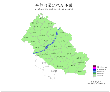 2025年9月28日16时至9月29日16时我县阴天有分散阵雨,最大降雨量为6.3mm(兴龙)。最低气温15.3 (南天湖景区)~25.2℃,最高气温20.2~35.2℃(兴龙)。武平出现9级阵性大风,极大风速21.9米/秒(武平峰子山,28日23时)。丰都国家基本站雨量0.3mm,最低气温24.0℃,最高气温32.0℃。