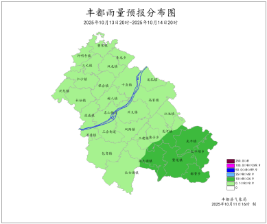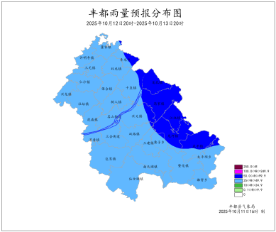 2025年10月10日16时至10月11日16时我县多云间晴。最低气温15.2 (南天湖景区)~29.4℃,最高气温18.9~38.8℃(兴龙)。董家、双路、名山、三建、包鸾、武平出现7-8级大风,极大风速18.3米/秒(武平峰子山,11日13时)。丰都国家基本站最低气温28.4℃,最高气温35.4℃。