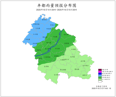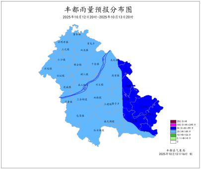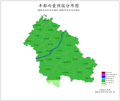 2025年10月11日16时至10月12日16时我县多云。最低气温15.2 (南天湖景区)~30.1℃,最高气温18.3~39.3℃(兴龙)。名山、龙孔、仙女湖、双路、三建、武平、包鸾、南天湖出现7-9级大风,极大风速22.6米/秒(名山镇江村,12日05时)。丰都国家基本站最低气温28.6℃,最高气温35.1℃。