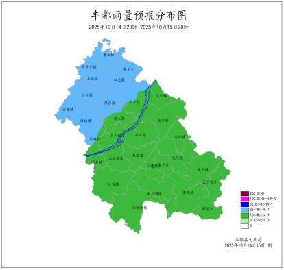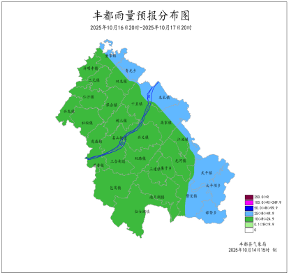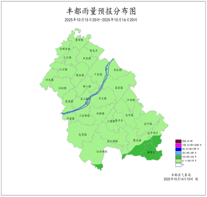 2025年10月13日16时至10月14日16时我县中到大雨,局地暴雨。最大降雨量为58.8mm(社坛);最低气温12.0 (仙女湖南天湖景区)~19.0℃,最高气温13.1~23.6℃(三建)。丰都国家基本站雨量24.2mm,最低气温17.6℃,最高气温20.5℃。