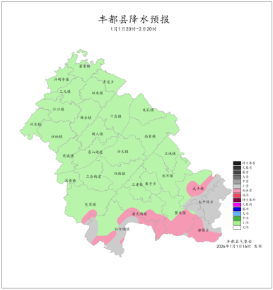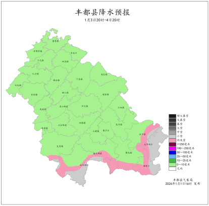2025年12月31日16时至1月1日16时我县小雨,高山区雨夹雪或小雪。最大降雨量为5.5mm(都督沙坪村),南天湖景区积雪厚度平均2-3cm;最低气温-2.1 (南天湖景区)~9.7℃,最高气温-1.5~11.1℃(三合岩脚崩滑体)。丰都国家基本站最低气温7.6℃,最高气温9.1℃。