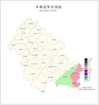 2026年1月26日16时至1月27日16时我县多云间晴,局地小雨。最大降雨量为0.8mm(旺龙村);最低气温-1.5 (南天湖景区)~7.4℃,最高气温1.6~16.5℃(三建)。丰都国家基本站最低气温6.1℃,最高气温14.2℃。