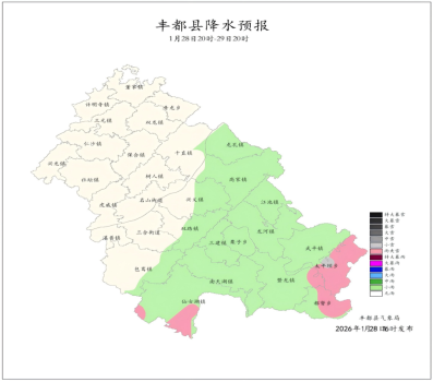 2026年1月27日16时至1月28日16时我县阴天。最低气温-2.1 (南天湖景区)~6.8℃,最高气温0.6~17.3℃(高家镇)。丰都国家基本站最低气温4.3℃,最高气温14.2℃。