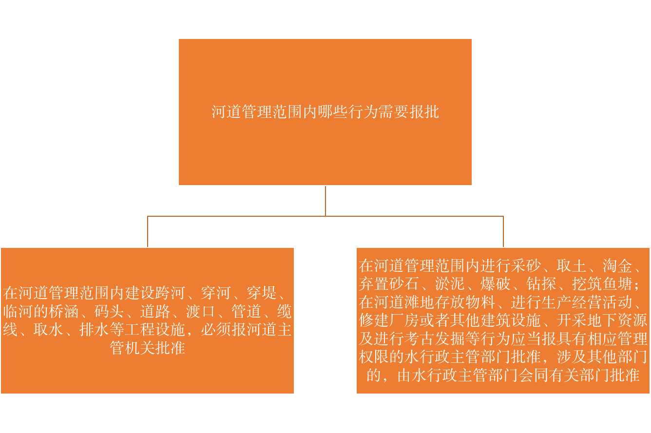1.在河道管理范围内建设跨河、穿河、穿堤、临河的桥涵、码头、道路、渡口、管道、缆线、取水、排水等工程设施,必须报河道主管机关批准。 2.在河道管理范围内进行采砂、取土、淘金、弃置砂石、淤泥、爆破、钻探、挖筑鱼塘;在河道滩地存放物料、进行生产经营活动、修建厂房或者其他建筑设施、开采地下资源及进行考古发掘等行为应当报具有相应管理权限的水行政主管部门批准,涉及其他部门的,由水行政主管部门会同有关部门批准。
