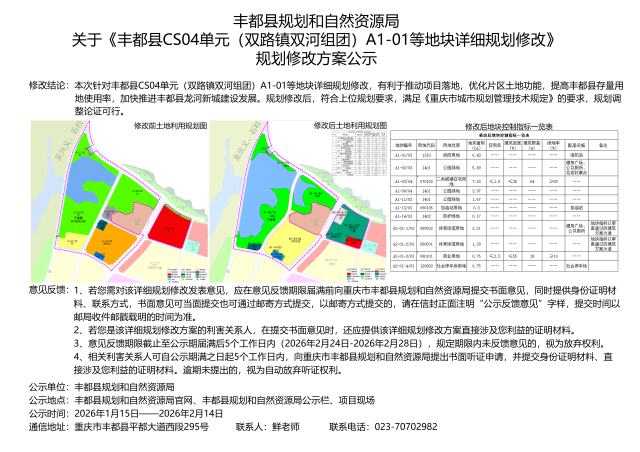 丰都县规划和自然资源局关于《丰都县CS04单元(龙河东组团)A1-01等地块详细规划修改方案》公示
