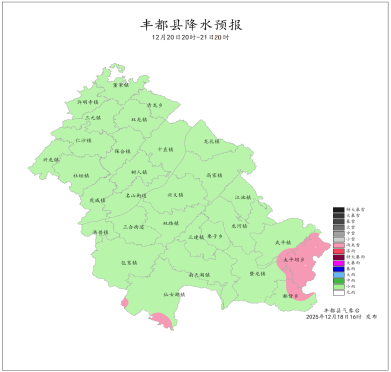 2025年12月17日16时至12月18日16时我县多云间晴。最低气温2.8 (太平坝)~11.3℃,最高气温9.1~20.4℃(江池)。丰都国家基本站最低气温9.6℃,最高气温17.0℃。