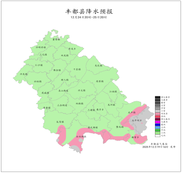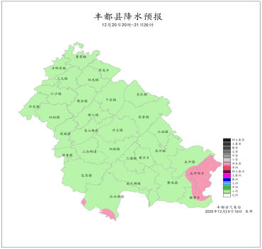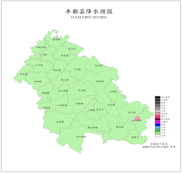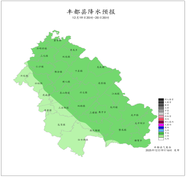 2025年12月12日16时至12月19日16时我县先雨后晴。最大周累计降雨量为23.5mm(武平峰子山)。最低气温-1.0 (太平坝)~10.2℃,最高气温10.8~20.4℃(江池)。丰都国家基本站周累计降雨量9.1mm,最低气温8.4℃,最高气温17.0℃。