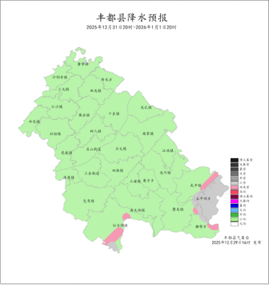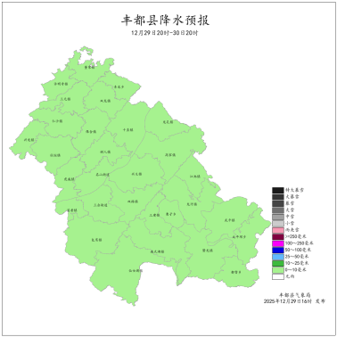 2025年12月28日16时至12月29日16时我县阴天。最低气温-1.8 (南天湖景区)~8.9℃,最高气温5.3~17.4℃(兴龙)。丰都国家基本站最低气温7.3℃,最高气温13.1℃。
