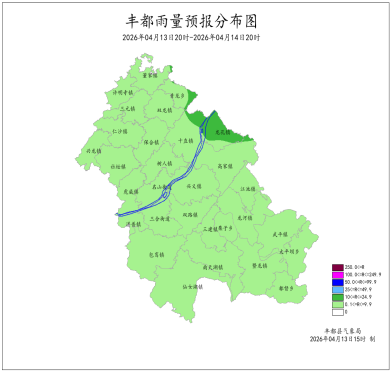 2026年4月12日16时至4月13日16时我县小到中雨。最大降雨量为21.3mm(南天湖景区);最低气温10.2 (南天湖景区)~18.0℃,最高气温11.6~25.9℃(兴龙)。丰都国家基本站雨量6.4mm,最低气温16.8℃,最高气温21.6℃。