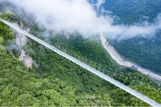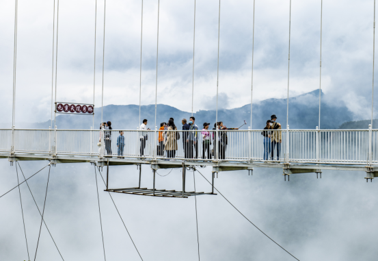 九重天景区位于丰都县双路镇莲花山,2018年12月被评为国家AAAA级景区,海拔700-1100米,距离县城18公里。景区内玻璃栈道全长3.5千米;5D高空玻璃吊桥,桥长300米,桥面宽2米,悬空高度达900余米。景区内还有悬崖秋千、飞拉达攀岩等体验项目,及紫藤长廊、天空之镜等网红打卡摄影点。