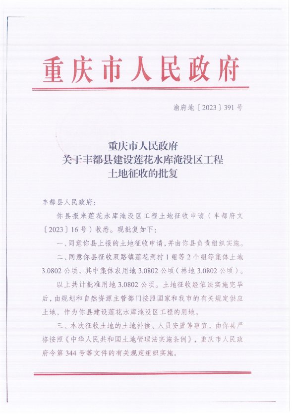 附件:重庆市人民政府《关于丰都县建设莲花水库淹没区工程农用地转用和土地征收的批复》(渝府地〔2023〕391号)