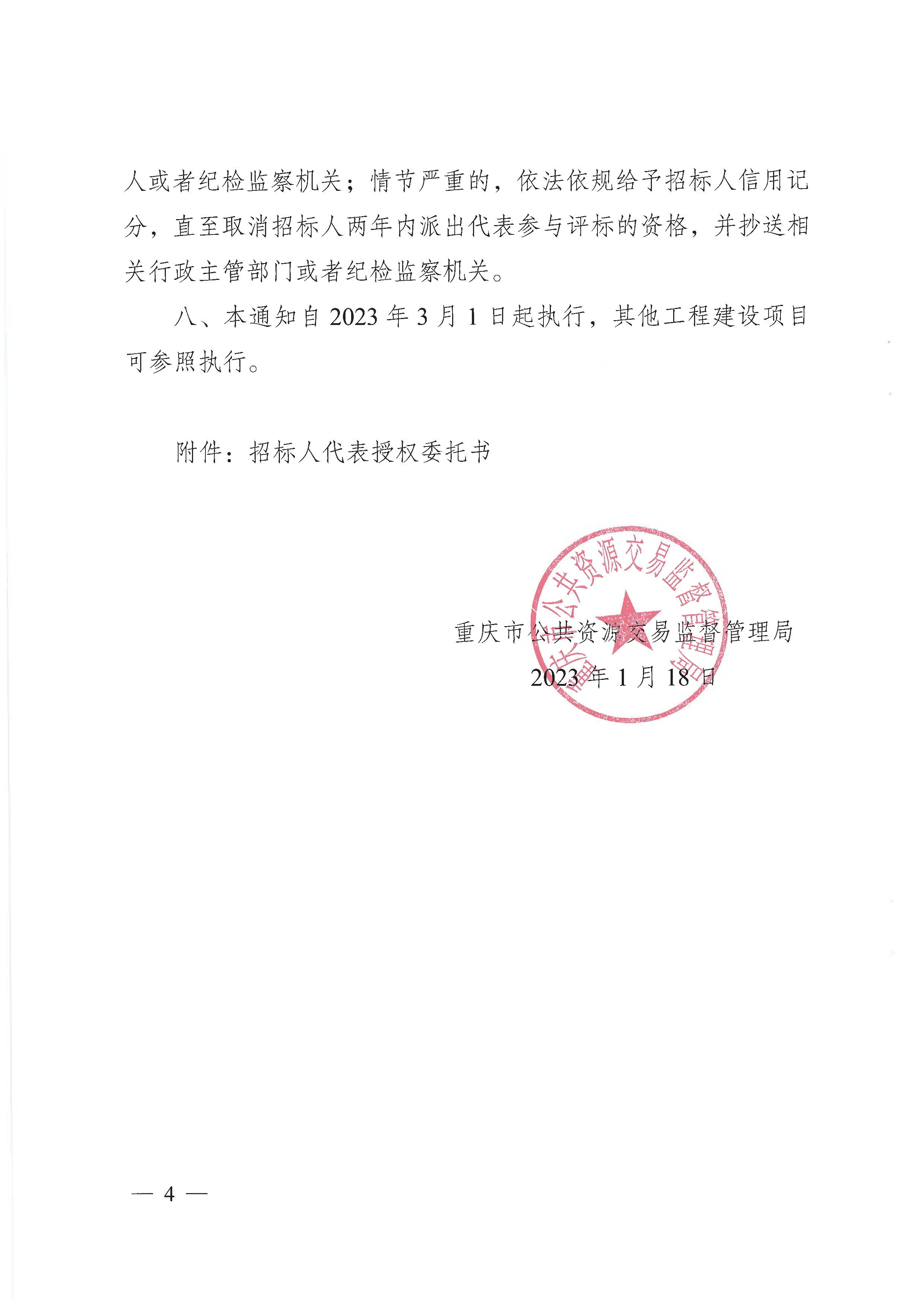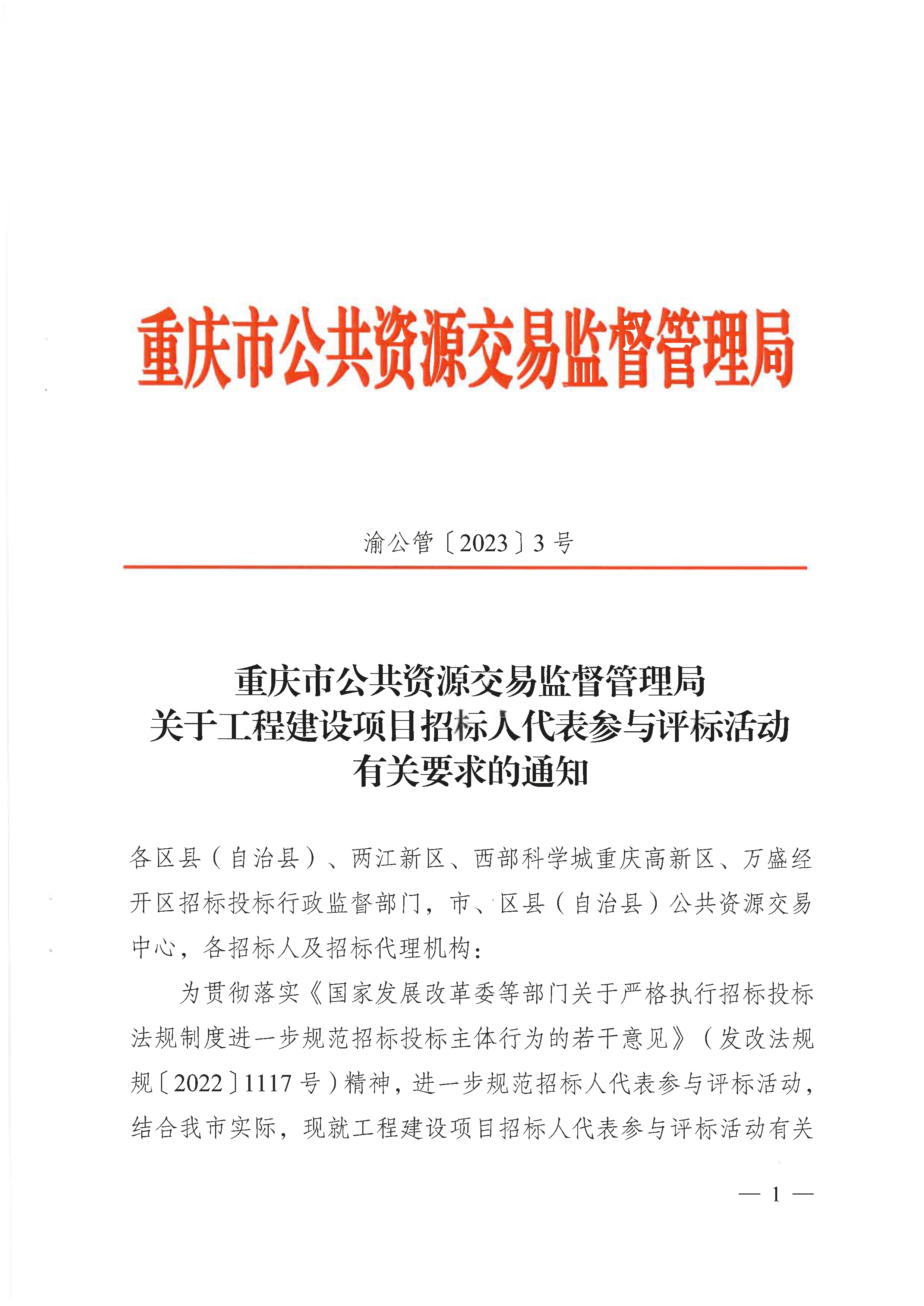 现将《重庆市公共资源交易监督管理局关于工程建设项目招标人代表参与评标活动有关要求的通知》(渝公管〔2023〕3号)转发给你们,请认真贯彻执行。
