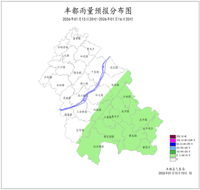 2026年1月14日16时至1月15日16时我县多云,局地小雨。最大降雨量为0.3mm(武平);最低气温-6.3(太平坝)~7.0℃,最高气温6.8~17.0℃(仙女湖黄沙)。丰都国家基本站雨量0.1mm,最低气温4.7℃,最高气温11.6℃。