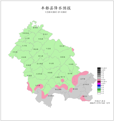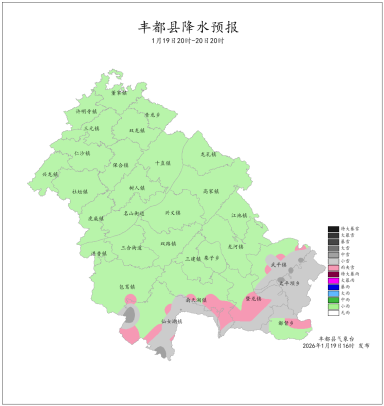 2026年1月18日16时至1月19日16时我县阴天,局地小雨。最大降雨量为2.4mm(暨龙乌羊坝);最低气温-0.4 (南天湖景区)~14.5℃,最高气温7.1~23.3℃(双龙)。丰都国家基本站最低气温12.9℃,最高气温19.2℃。