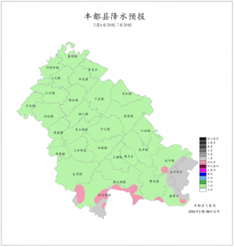 2026年2月4日16时至2月5日16时我县阴天间多云。最低气温-1.3 (南天湖景区)~10.2℃,最高气温5.2~18.0℃(名山镇江村)。丰都国家基本站最低气温8.4℃,最高气温15.7℃。