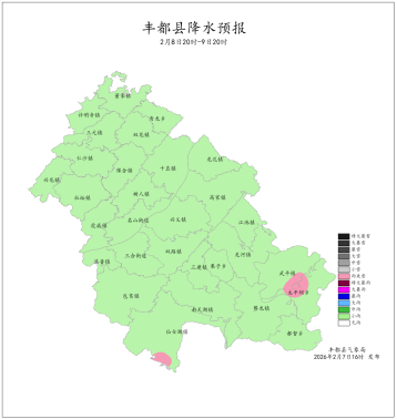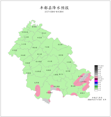 2026年2月6日16时至2月7日16时我县阴天有小雨。最大降雨量为1.7mm(江池横梁);最低气温-1.2 (南天湖景区)~10.8℃,最高气温2.4~20.5℃(兴龙)。丰都国家基本站最低气温10.0℃,最高气温17.3℃。