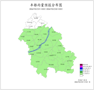 2026年2月28日16时至3月1日16时我县小到中雨,局地大雨。最大降雨量为27.7mm(仙女湖李家湾);最低气温1.8 (南天湖景区)~13.3℃,最高气温5.8~19.0℃(仙女湖黄沙)。丰都国家基本站雨量0.3mm,最低气温11.5℃,最高气温15.7℃。