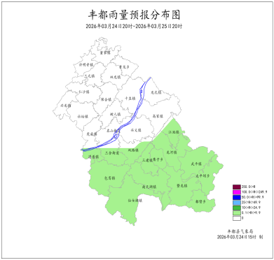 2026年3月23日16时至3月24日16时我县阴天有小雨。最大降雨量为11.9mm(江池横梁);最低气温5.7 (南天湖景区)~14.5℃,最高气温7.6~18.2℃(名山镇(航道))。丰都国家基本站雨量5.2mm,最低气温13.2℃,最高气温15.6℃。