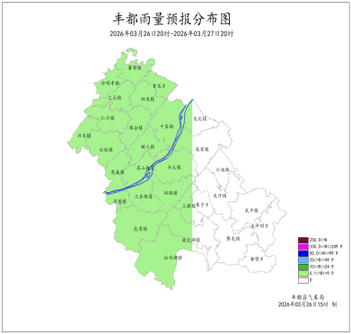 2026年3月25日16时至3月26日16时我县阴天有阵雨。最大降雨量为15.8mm(十直新屋);最低气温6.2 (南天湖景区)~15.4℃,最高气温11.3~22.9℃(兴龙)。丰都国家基本站雨量11.0mm,最低气温14.0℃,最高气温19.1℃。
