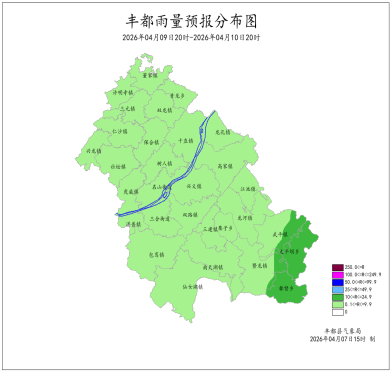2026年4月6日16时至4月7日16时我县小雨转阴天间多云。最大降雨量为5.9mm(董家);最低气温7.8 (南天湖景区)~17.2℃,最高气温11.1~25.6℃(仙女湖黄沙)。都督出现7级大风,极大风速14.3米/秒(都督沙坪村,6日21时)。丰都国家基本站雨量1.1mm,最低气温15.9℃,最高气温20.1℃。