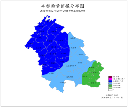 2026年4月26日16时至4月27日16时我县阴天有阵雨,雨量小到中雨。最大降雨量为12.6mm(都督沙坪村);最低气温11.4 (南天湖景区)~20.8℃,最高气温13.6~27.8℃(包鸾马良大桥)。丰都国家基本站最低气温19.3℃,最高气温24.5℃。