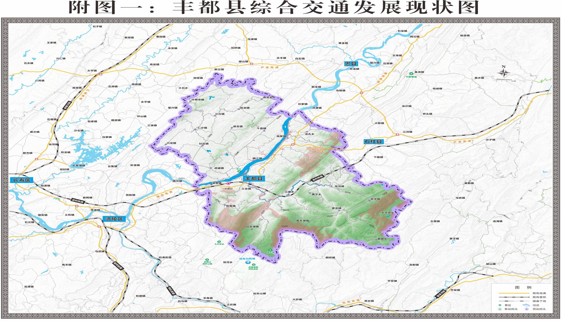 《交通强国建设纲要》于2019年9月,由中共中央、国务院印发实施。提出构建安全、便捷、高效、绿色、经济的现代化综合交通体系,到2035年基本形成“全国123出行交通圈”和“全球123快货物流圈”。同年10月交通运输部将重庆列为全国第一批试点城市之一,并明确建设内陆国际物流枢纽高质量发展、成渝地区双城经济圈交通一体化发展、山水城市交旅融合发展、内河水运集约绿色发展等共5个试点任务。2021年2月中共中央、国务院印发《国家综合立体交通网规划纲要》,成渝跻身全国交通“第四极”,要求建设以成都、重庆为中心的成渝地区双城经济圈国际性综合交通枢纽集群,将重庆定位为西部国际综合交通枢纽和国际门户枢纽,要求重庆建设国际性铁路、航空等枢纽港站。2021年10月12日,市委陈敏尔书记在全市交通强市建设工作推进会上要求,要全面落实交通强国战略部署,并正式发布《重庆市综合立体交通网规划纲要(2021-2035年)》,提出到2035年,重庆将基本建成便捷顺畅、经济高效、绿色集约、智能先进、安全可靠的现代化高质量综合立体交通网。《2022年丰都县人民政府工作报告》提出,要全面建强基础设施,实施交通强县。要求推动丰都交通发展由追求速度规模向更加注重质量效益转变,由各种交通方式相对独立发展向更加注重一体化融合发展转变,由依靠传统要素驱动向更加注重创新驱动转变,构建安全、便捷、高效、绿色、经济的现代化综合交通体系。