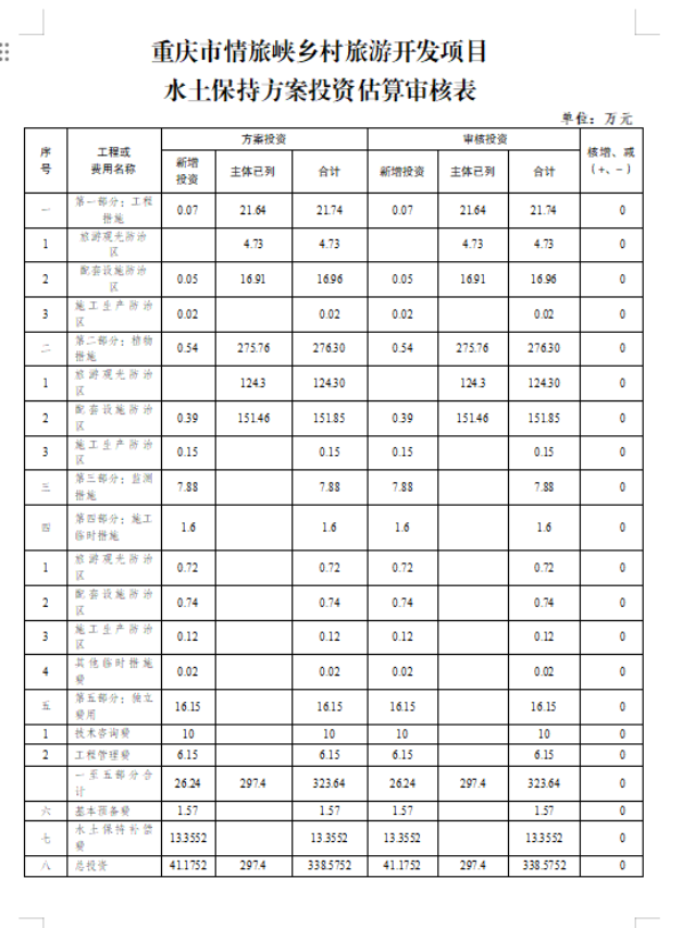 本项目水土保持总投资338.5752万元,其中主体已列297.40万元,方案新增41.1752万元。新增投资中:工程措施0.07万元,植物措施0.54万元、监测措施7.88万元、施工临时措施1.60万元、独立费用16.15万元、基本预备费1.58万元、水土保持补偿费13.3552万元。