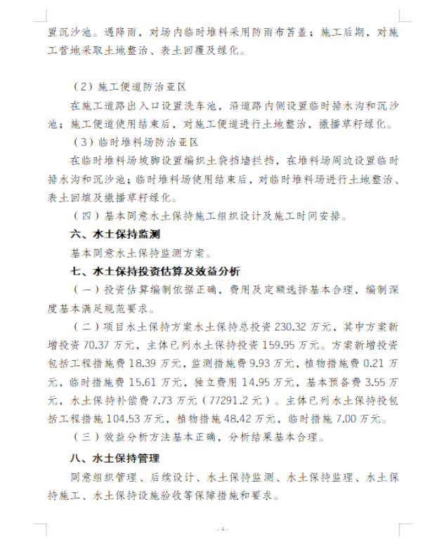 本项目水土保持总投资230.32万元,其:主体已列159.95万元,方案新增70.37万元,方案新增投资包括工程措施18.39万元,监测措施9.93万元,植物措施0.21万元,临时措施费15.61万元,独立费用14.95万元,基本预备费3.55万元,水土保持补偿费7.73万元(77291.2元)。
