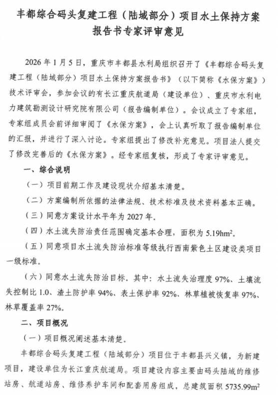 2.丰都综合码头复建工程(陆域部分)项目水土保持方案报告书专家评审意见
