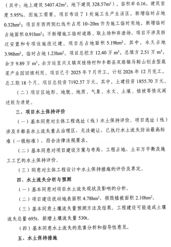 丰都综合码头复建工程(陆域部分)项目位于丰都县兴义镇,为新建项目,建设单位为长江重庆航道局。项目的建设内容主要由码头陆域的维修站房、航道站房、维修养护车间和配套用房组成。项目总占地面积为5.19hm2,其中,永久占地3.96hm2,临时占地1.23hm2。本项目挖方12.40万m3,填方2.51万m3,余方9.89万m3。余方运至兴义镇双桂杨村和丰都县双路镇马鞍山创业型蔬菜产业园回填利用。项目已于2025年7月开工,计划2026年12月完工,总工期18个月。项目总投资7192.57万元,其中,土建投资1855.70万元。
