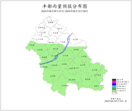 2024年5月6日16时至5月7日16时我县阴天到多云,最低气温8.1~20.1℃,最高气温19.9~34.3℃。丰都国家基本站最低气温18.4℃,最高气温30.1℃。