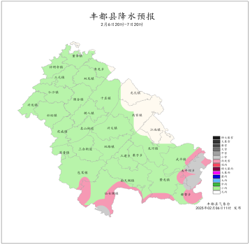 2025年2月5日16时至2月6日16时我县阴天有间断小雨,高海拔山区有雨夹雪或小雪。最大降雨量为2.7mm(都督)。最低气温-3.1~9.2℃,最高气温-0.9~11.9℃。丰都国家基本站雨量0.5mm,最低气温7.4℃,最高气温10.2℃。