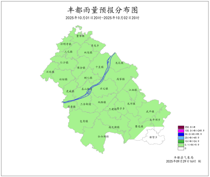 2025年9月28日16时至9月29日16时我县阴天有分散阵雨,最大降雨量为6.3mm(兴龙)。最低气温15.3 (南天湖景区)~25.2℃,最高气温20.2~35.2℃(兴龙)。武平出现9级阵性大风,极大风速21.9米/秒(武平峰子山,28日23时)。丰都国家基本站雨量0.3mm,最低气温24.0℃,最高气温32.0℃。