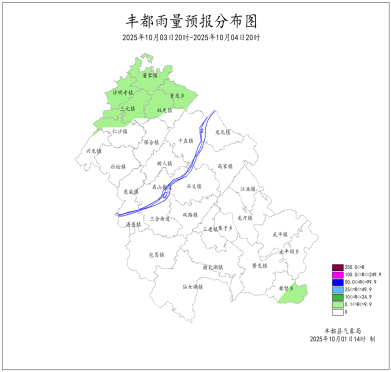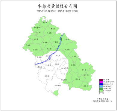 2025年9月30日16时至10月1日16时我县阴天间多云,有阵雨。最大降雨量27.4mm(三元何家坝);最低气温15.4 (南天湖景区)~24.1℃,最高气温18.0~36.1℃(三元何家坝)。暨龙、高家、仙女湖、三建、武平出现7-9级大风,极大风速22.0米/秒(武平峰子山,1日12时)。丰都国家基本站雨量0.5mm,最低气温22.6℃,最高气温31.9℃。