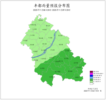 2025年11月5日16时至11月6日16时我县阴天,局地小雨。最大降雨量为4.0mm(都督沙坪村);最低气温4.8 (南天湖景区)~17.4℃,最高气温7.9~20.4℃(三建)。丰都国家基本站最低气温15.7℃,最高气温18.4℃。