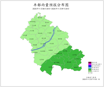 2025年10月31日16时至11月7日16时我县阴天间多云,局地有小雨。最大周累计降雨量为11.5mm(都督沙坪村)。最低气温2.3~13.6℃,最高气温10.9~26.7℃。丰都国家基本站周累计降雨量0.6mm,最低气温12.0℃,最高气温21.4℃。