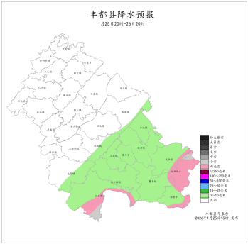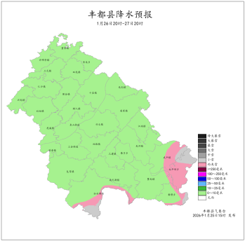 2026年1月24日16时至1月25日16时我县阴天,局地小雨。最大降雨量为0.6mm(暨龙乌羊坝);最低气温-3.0 (南天湖景区)~9.1℃,最高气温0.0~11.1℃(三元)。丰都国家基本站最低气温7.0℃,最高气温8.8℃。
