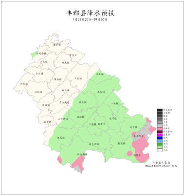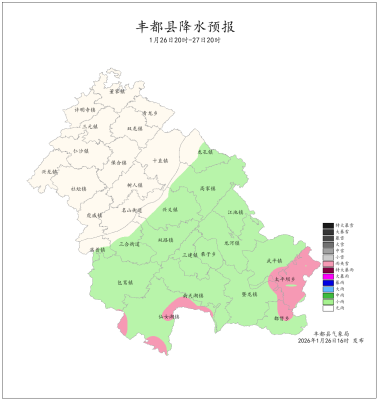 2026年1月25日16时至1月26日16时我县阴天有小雨。最大降雨量为5.2mm(江池横梁);最低气温-2.2 (南天湖景区)~8.0℃,最高气温0.0~11.2℃(名山镇江)。丰都国家基本站雨量0.4mm,最低气温6.3℃,最高气温8.8℃。