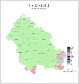 2026年1月26日16时至1月27日16时我县多云间晴,局地小雨。最大降雨量为0.8mm(旺龙村);最低气温-1.5 (南天湖景区)~7.4℃,最高气温1.6~16.5℃(三建)。丰都国家基本站最低气温6.1℃,最高气温14.2℃。