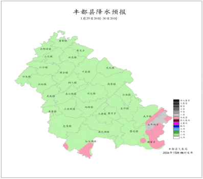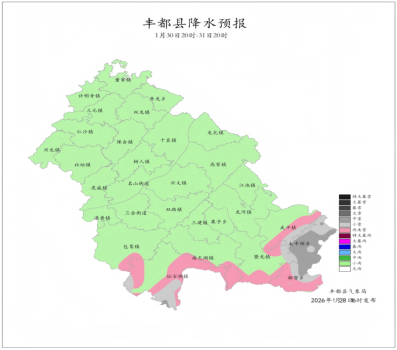 2026年1月27日16时至1月28日16时我县阴天。最低气温-2.1 (南天湖景区)~6.8℃,最高气温0.6~17.3℃(高家镇)。丰都国家基本站最低气温4.3℃,最高气温14.2℃。