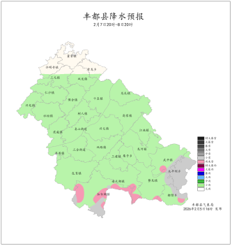2026年2月4日16时至2月5日16时我县阴天间多云。最低气温-1.3 (南天湖景区)~10.2℃,最高气温5.2~18.0℃(名山镇江村)。丰都国家基本站最低气温8.4℃,最高气温15.7℃。