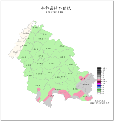 2026年2月7日16时至2月8日16时我县阴天到多云,局地小雨。最大降雨量为0.4mm(江池横梁);最低气温-5.7 (南天湖景区)~9.2℃,最高气温-1.3~17.1℃(名山农花村)。双路、三建、仙女湖出现7级大风,极大风速15.2米/秒(双路,7日20时)。丰都国家基本站最低气温8.2℃,最高气温14.2℃。